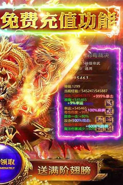 《热血龙城-免费充值》是一款全新大型放置类传奇游戏,首充立即开启免费充值功能!免费充值激活任意奖励!!!游戏还拥有精致的画面和炫丽的技能效果,三职融合,战士带狗,极致攻伤,一刀致命!PK打宝战沙城,热血豪杰闯天下!游戏内Boss超多,打完后还可以挖掘Boss出钻石,装备爆率高可回收百万钻石。龙皇秘宝还可以出热血神装,神装技能焚天灭地斩全屏爆龙。除此之外还有土豪装备,左手神兵灭霸手套等超多装备法宝。兄弟在聚热血争沙,赶紧和兄弟们一起进服吧!