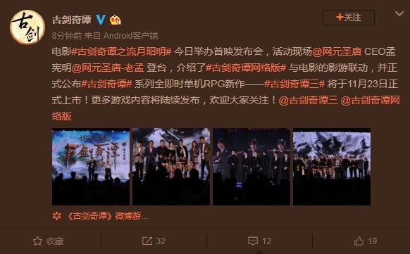 《古剑奇谭》官方微博宣布,在《古剑奇谭之流月昭明》首映发布会现场,网元圣唐CEO孟宪明登台,介绍了《古剑奇谭网络版》与电影的联动计划,并宣布系列全即时单机RPG新作《古剑奇谭三》将于11月23日正式上市。