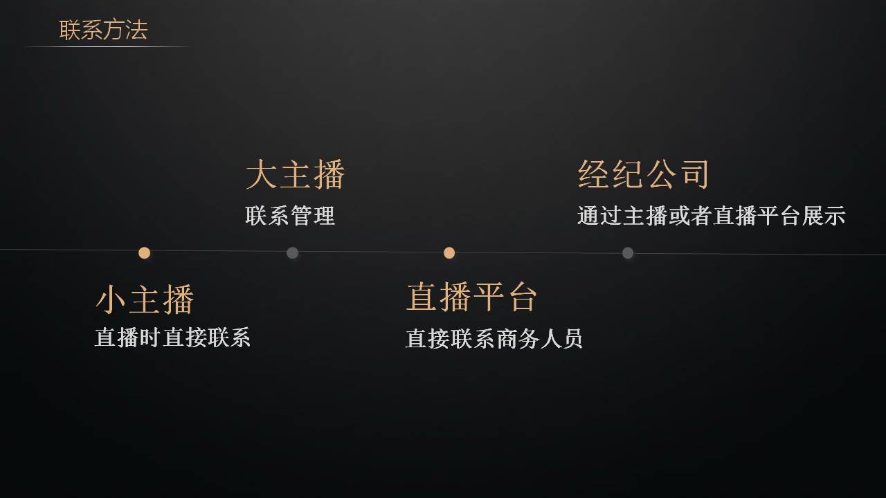 怎么样联系这些主播:小主播就直接到他的直播间跟他聊就可以了,几十到几千人的都算小主播,可能其中大部分是他挂的机器人真正在线就几十个人,他可能都不需要分成你给他刷点礼物他就很高兴了。大主播就比较正规了,要联系直播的管理,有的平台靠马甲区分有的靠称号区分都不同,到时进到平台里可以看到管理私聊他就可以了。再往上就是经纪公司,一般都是什么传媒公司/娱乐公司,他手中养着很多主播,经纪公司可以通过主播或者直播平台的展示去联系。最后可以去联系一些小的直播平台的商务人员,因为小的直播平台靠刷礼物不够养活自己,也在考虑做其他行业合作的考虑。一些大的直播平台,比如YY他有自己的游戏平台,直播和游戏是很亲密的关系,如果这个平台还没有自己的游戏平台可以跟他谈下,不过这个讲究平台的实力,门当户对嘛。