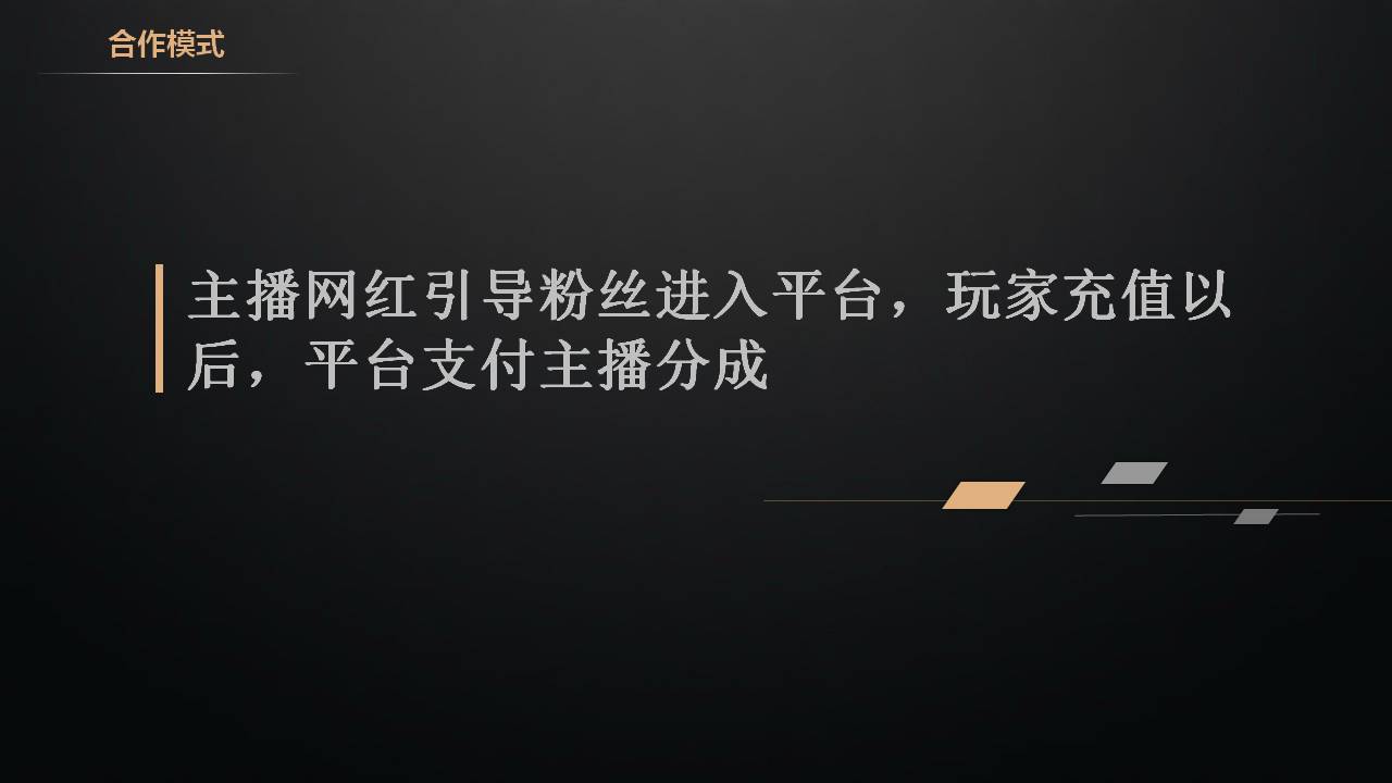 合作模式:公会引导玩家进入平台玩游戏,玩家充值以后,平台支付公会分成,按点位分成,30、50或者70,不同的游戏分成比例也不一样。那什么是公会家族呢?刚开始公会家族并不是专门去赚钱的,他只是玩家的一个组织群体,大家在游戏中抱团取暖,比如创建帮派、家族、军团这些,不同游戏叫法不一样。后来由于联运模式的兴起,咱们做运营的运营商就发现这里面的商机了,我可以提供给他游戏中的道具甚至是返点,让公会长带领他的小兄弟来我的平台玩游戏消费,这样他玩的又好又获利,何乐而不为呢。咱们也可以这样去做,有好多的公会现在都是职业的家族工作室,已经不以玩游戏为目的了,完全商业化的去运作了。
