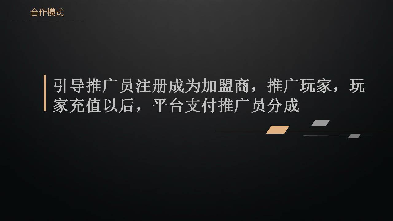 加盟商合作要点,分成点位诱人,阶梯分成,咱们一直在强调阶梯分成,因为CPS合作的就是分成。其次呢模式要简单易懂,拿个链接就可以做,宣传就是一键代理几百款游戏,只要他把链接发出去别人点他的链接进游戏就可以了。我们还要提高服务,即时结算,日结秒到,加上官方指导,我们自己也在帮你做宣传,帮你推广,你就成为我们的加盟商,月入百万不是梦。很多人就是看到这种广告入行的,做了一段时间才发现自己做的是推广而不是运营,很多人都有做游戏的梦,但是他们不太清楚用户的重要性,能给他分成他就很高兴了。咱们就是这样去做加盟的宣传,吸引推广员。