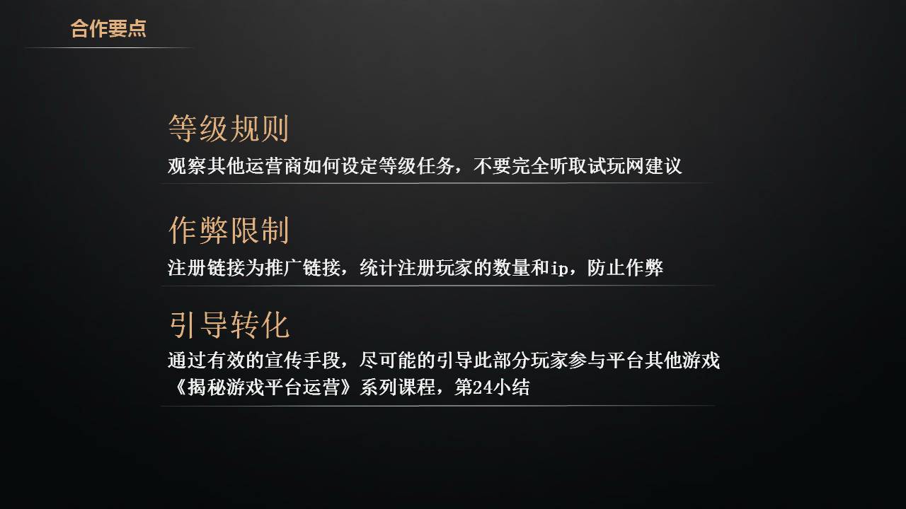 合作要点:错峰发布,错开其他运营商的开服高峰,减少竞争,除非你有信心。统计效果,每个开服表发布的注册链接,均为推广链接,我们可以统计注册和充值,效果好的我们就可以做他的付费广告,更好的提升咱们的效果。内容把握,遵循“观察竞争对手”和“更有吸引力原则”,不了解的可以看《揭秘游戏平台运营》系列课程,第16小结。
