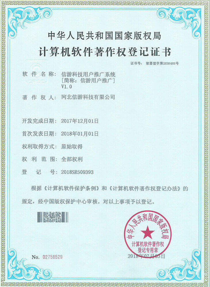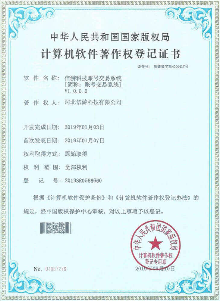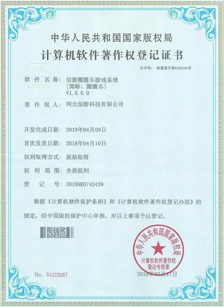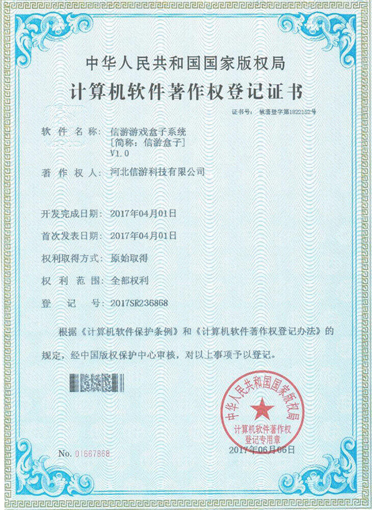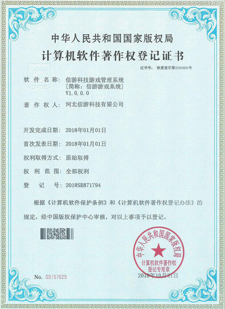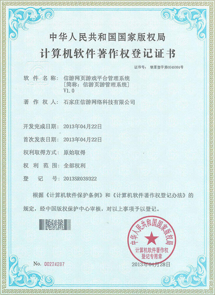 信游页游平台系统获得《计算机软件著作权证书》