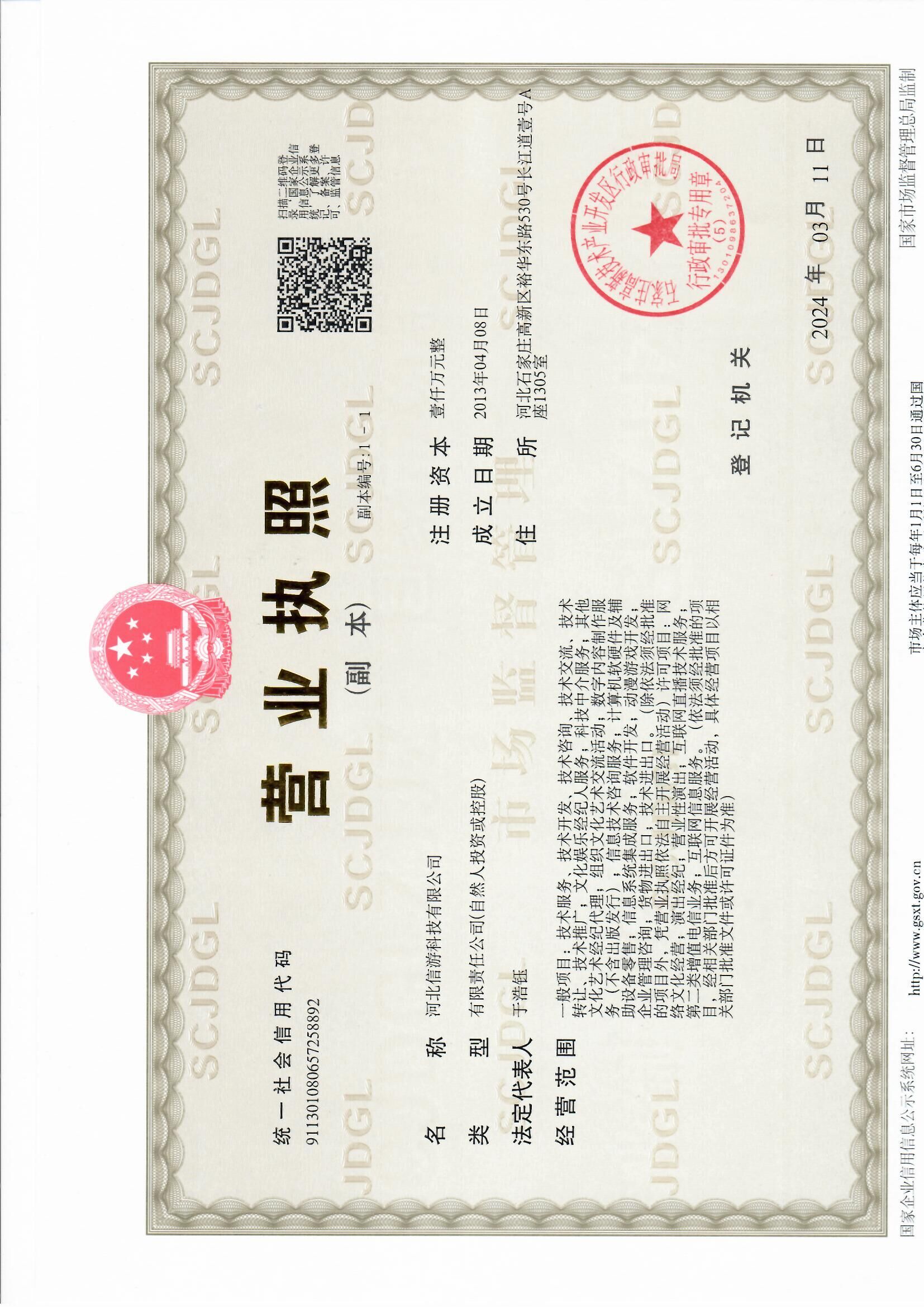 信游科技于河北石家庄完成工商注册,成为一家专门从事页游平台系统研发的企业